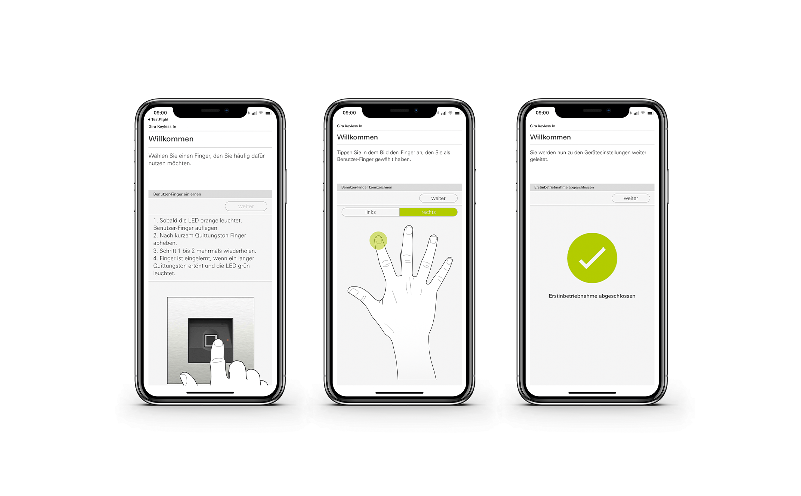 Die Inbetriebnahme und Konfiguration des Gira System 106 Keyless In Fingerprintmoduls erfolgt Wizard-geführt, Schritt für Schritt mittels einer leicht nachvollziehbaren Fragensystematik über die Gira Keyless In App. Insgesamt lassen sich bis zu 100 Finger für eine Zugangsberechtigung registrieren und verwalten – einfach und übersichtlich.