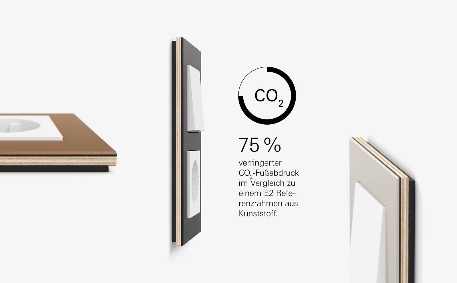 Die Farbvarianten Gira E2 Grau matt und Farbe Alu sind die richtige Wahl für Kundinnen und Kunden mit ausgeprägtem Umweltbewusstsein. Denn die Kunststoffteile der lackierten Farbvarianten bestehen zum grössten Teil¹ aus Rezyklat, das im Vergleich zu Neumaterial einen verringerten CO₂-Fussabdruck aufweist.²