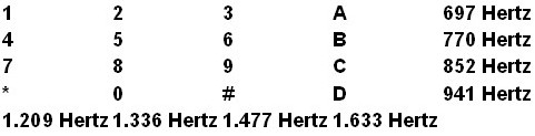 Die Abkürzung DTMF steht für Digitales Ton- /Mehrfrequenz-Wahlverfahren. MFV ist die Abkürzung für Mehrfrequenz-Wahlverfahren. Aus der folgenden Tabelle (siehe Bild) lässt sich ablesen, aus welchen beiden Frequenzen sich die Codierung der einzelnen Ziffern- und Funktionstasten zusammen setzt:
