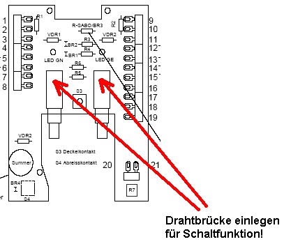 Der Umbau auf die Schaltfunktion erfolgt durch das Einsetzen der Drahtbrücke (oberhalb der Feder) am Taster-/ Schalterkontakt (siehe Abbildung).