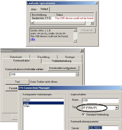 Trotz ausgewählter USB-Schnittstelle kann der Projektierer nicht auf den Bus zugreifen. Die ETS 3 Professional meldet im Dialog "Laufende Operationen": The USB device could not be found.