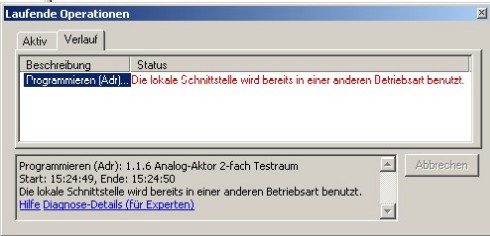 Wenn bei dem Versuch, ein Gerät aus der ETS 3 Professional zu programmieren, die Meldung "Die lokale Schnittstelle wird bereits in einer anderen Betriebsart benutzt." erscheint (siehe Bild 1), dann belegt ein anderes Modul der ETS 3 Professional die Schnittstelle (z. B. der Bustelegramm-Monitor). Sollte dieses Modul aktiv, d.h. bei laufender Aufzeichnung minimiert werden, ist das nicht unmittelbar zu erkennen bzw. zu sehen.