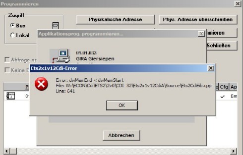 Welche Ursache liegt vor, wenn beim Programmieren des SmartSensor über die ETS die Fehlermeldung "Error: dwMemEnd < dwMemStart... " erscheint (siehe Abbildung) und auch der aktivierte Parameter "Beim nächsten Download keinen Fast Download zulassen" keine Verbesserung bewirkt?