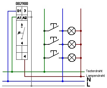 Der Automatikschalter REG kann nur in einer Treppenhaus-Sparschaltung (Bild 1) eingesetzt werden, wenn die gesammte Schaltung angepasst wird (siehe Bild 2). Durch die Anpassung ist es nicht möglich, die Zuleitung in das Treppenhaus für weitere Geräte zu nutzen. Ein "Umklemmen" vor Ort ist nicht nötig.