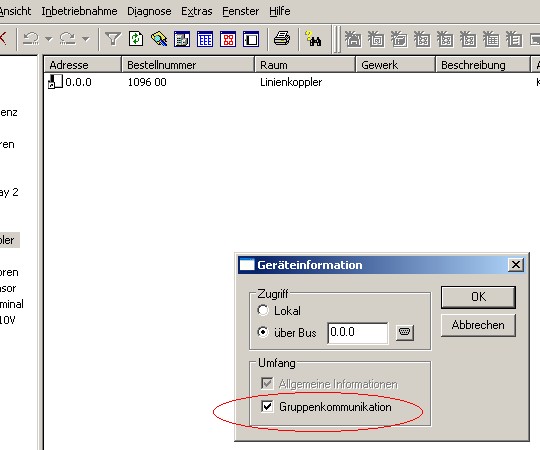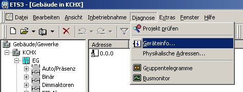 Wählen Sie im Menü der ETS 3 den Menüpunkt Diagnose/Geräte-Info aus (siehe Bild 2). Das Fenster Geräte-Info für den Linienkoppler öffnet sich (siehe Bild 3).