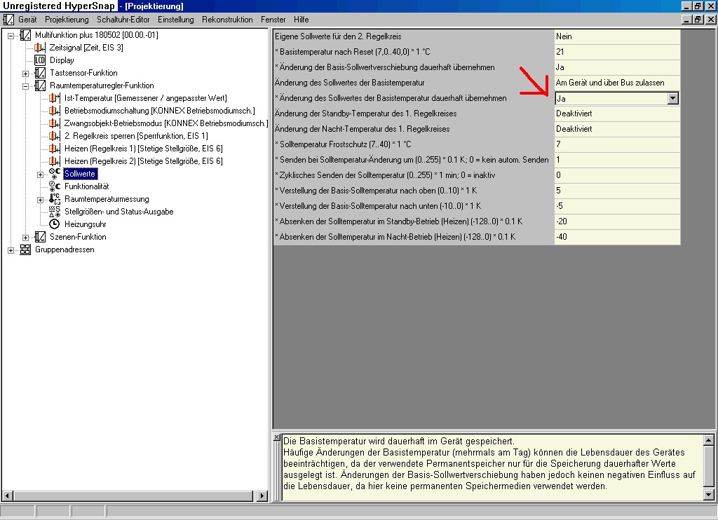 Wurde im PlugIn die Änderung des Sollwertes der Basistemperatur dauerhaft übernehmen (siehe Bild) parametriert, dann wird der geänderte Sollwert immer wieder neu in das EEProm gespeichert.