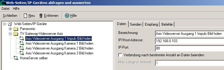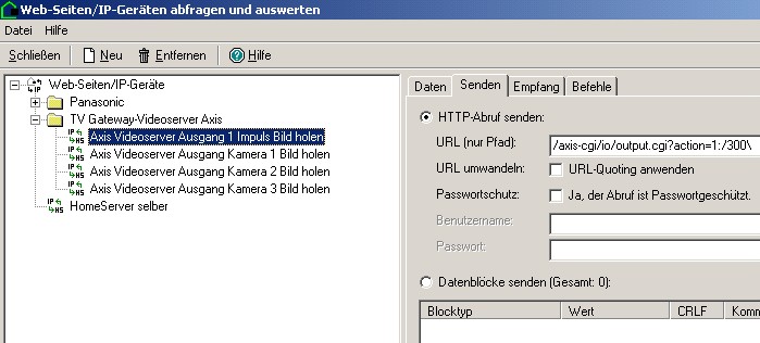 Soll eine Kamera gezielt aufgerufen werden, ist der Sende-Parameter den zugeordneten Relaisausgängen anzupassen. Mögliche Parameter für einen Impuls am Relais mit der Dauer von 300 ms: /axis-cgi/io/output.cgi?action=2:/300\