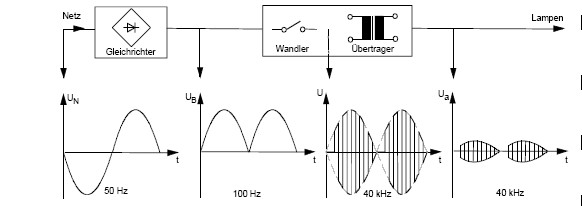 Dazu muss die 50-Hz-Netzspannung zunächst in eine Wechselspannung mit hoher Frequenz gewandelt werden. Zur Unterscheidung zu herkömmlichen 50 Hz-Trafos/Netzteilen spricht man von elektronischen Trafos/Schaltnetzteilen (SNT) oder kurz "Tronic-Trafos".