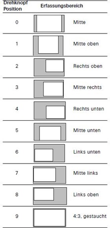 Nein die Kamera ist nicht schwenkbar. Der Bildbereich kann aber eingestellt werden. Über den auf der Rückseite befindlichen Drehschalter können fixe Bildausschnitte (weiß) des Gesamtbilds (grau) vergrößert dargestellt werden. Position „0“ = Auslieferungszustand.