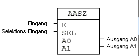 Der AASZ-Block schaltet den Eingang auf einen der zwei Ausgänge. Der Selektions-Eingang ist vom Datentyp "Bit". Ist SEL 0, wird der Ausgang A0 ausgewählt, ansonsten A1. Der nicht ausgewählte Ausgang ändert seinen Wert nicht. Nach einem Reset am Funktionsmodul hat der nicht selektierte Ausgang den Wert 0.