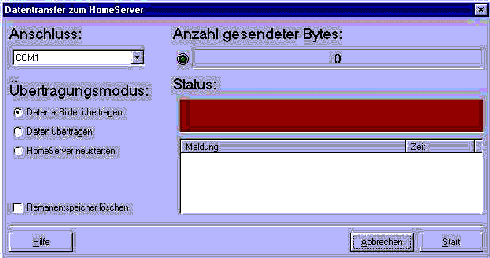 Klicken Sie auf den Button Transfer. Dieser befindet sich unterhalb der Hauptmenüleiste. Das Fenster Datentransfer zum HomeServer öffnet sich (siehe Anhang).