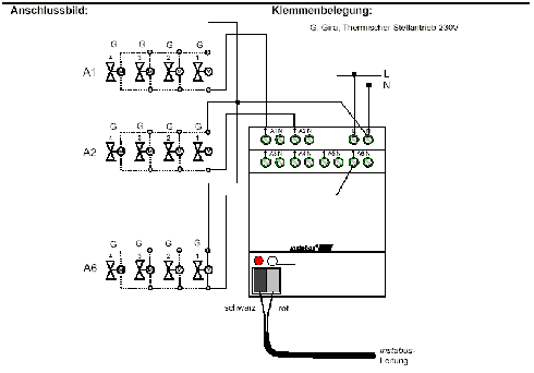 Der Neutralleiter von den Stellantrieben kann zusammengefasst und dann an der N-Klemme der Spannungsversorgung für den Heizungsaktor angeschlossen werden (Schaltbild siehe Anhang).