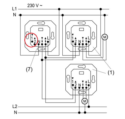 Der Regenwächter kann, wie jeder andere 230 V Geber, auf die Nebenstelleneingänge (1 oder 2) des Jalousiesteuerung-Einsatzes verdrahtet werden. Hierdurch ist eine Zentral-Ab-Funktion bei Regen realisierbar.