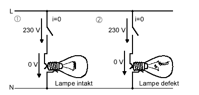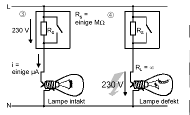 Halbleiterschalter (z. B. Triac und MOSFET) trennen den Stromkreis nicht galvanisch. Es fließt also auch im ausgeschalteten Zustand immer ein geringer Sperrstrom (wenige mA). Wenn ein Leuchtmittel ausfällt oder ausgetauscht wird, kann dieser Strom nicht fließen. Da der elektrische Widerstand an der Unterbrechungsstelle sehr viel größer ist als der des Halbleiterschalters, liegt dann die gesamte Netzspannung an den Leuchtenkontakten (siehe Bild 2).