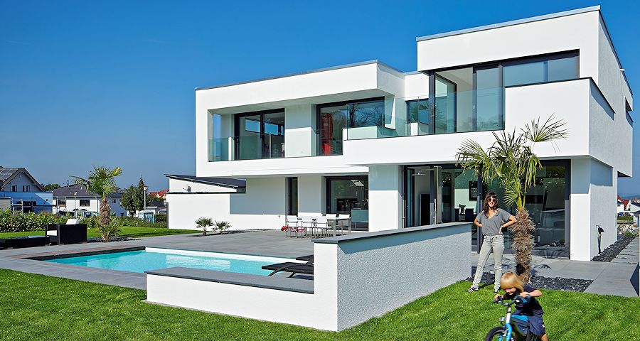 Im Zentrum steht ein Swimmingpool, in dem die sportliche Familie regelmäßig ihre Bahnen zieht. Abgerundet wird dieses Flair durch Palmen, die karibisches Feeling herbeizaubern. Damit diese den Winter überstehen, wurde das sie umgebende Erdreich mit einer Bodenheizung ausgestattet. Die Garten- und Poolbeleuchtung sorgt dafür, dass die Villa auch abends um den Außenbereich erweitert wird.